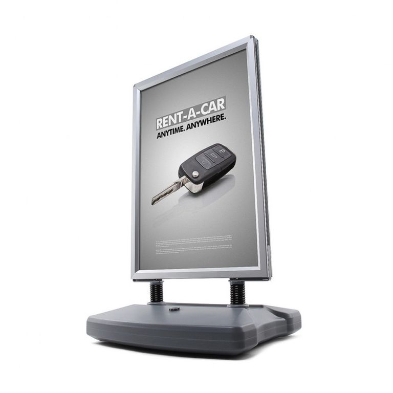 Speziell für Ihre Werbung in windigen Bereichen ist der Kundenstopper WINDTALKER® von indieprint in Deutschland die optimale Lösung. Sein mit Wasser oder Sand befüllbarer Standfuß bietet in Verbindung mit den Spezialfedern aus Stahl eine hohe Standfestigkeit. Für den einfachen Transport sind im Standfuß Rollen integriert. So können Sie den Kundenstopper trotz des Standgewichtes einfach bewegen. Der Aluminium-Schnellwechselrahmen kann doppelseitig mit Plakaten bestückt werden und garantiert Ihnen auch bei hohen Windstärken eine auffällige Werbemöglichkeit.