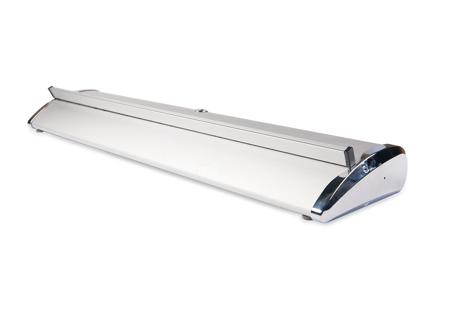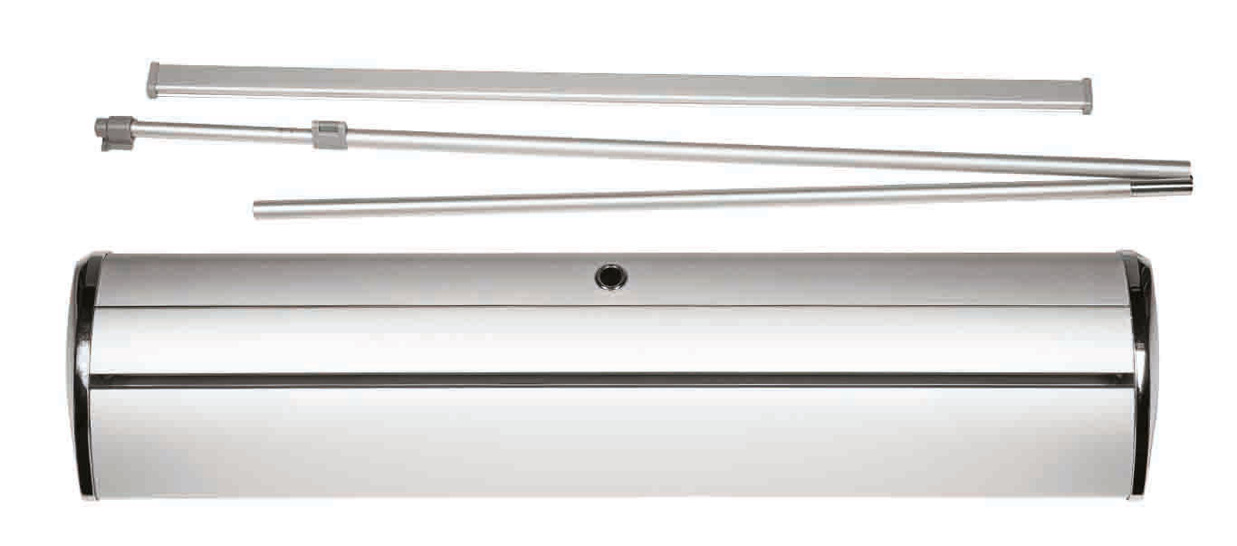 Mit dem Roll-Up Banner von indieprint in Deutschland erhalten Sie ein Banner aus der Standard-Reihe. Dieser ist Silber eloxiert und kommt mit einer Klemmschiene sowie verchromte Endkappen daher. Die beiden verchromten Endkappen stechen bei diesem System besonders hervor und verleihen Ihnen einen exclusiven Auftritt. Auch für Messen, Events, Ausstellungen, Werbeaktionen und Ähnliches eignet der Roll-Up Banner sich ideal, denn er kann einfach und bequem in der mitgelieferten Transporttasche transportiert werden.