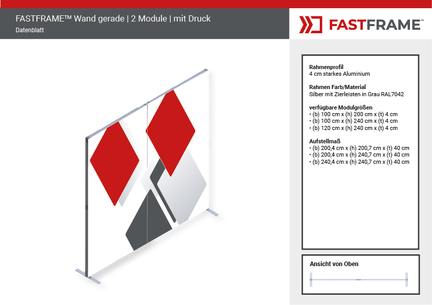 Der FASTFRAME™ gerade Wand mit 2 Modulen ist die ideale Lösung für professionelle Präsentationen, Messen und Events. Dank seines leichten, vormontierten Aluminiumrahmens mit 40 mm Profil lässt er sich in Sekundenschnelle aufstellen – ganz ohne Werkzeug. Eine zentrale Stützstange sorgt für zusätzliche Stabilität, während optionale Standfüße den Halt optimieren.
