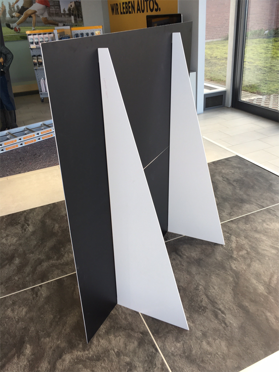 Die Größe der Platten ist variabel, ab einem Mindestformat von 10 cm x 10 cm können Höhe und Breite frei gewählt werden. Dabei kann entweder auf Format oder auf Kontur geschnitten werden, sodass auch andere Formen als viereckig möglich sind. Das verwendete Material ist weißer Hartschaum mit einer Dicke von 10 mm. Zur leichteren Anbringungen können in den Ecken vorgebohrte Löcher mit einem Durchmesser von 4 mm angebracht werden. Die Platten stehen aber auch ohne Bohrung zur Verfügung.